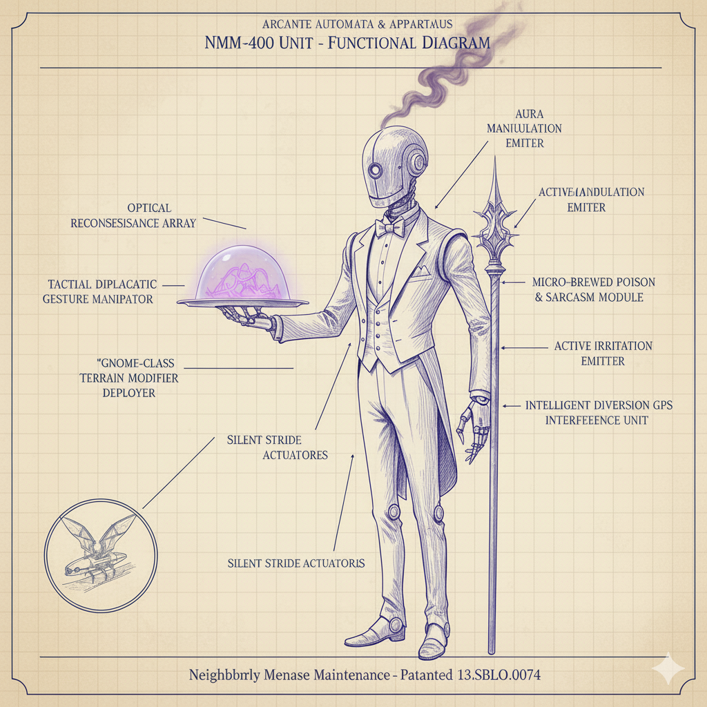 This was precisely the predicament facing Queen Malvolta, Sovereign of the Shadow Plains and resident of the notorious Dark Citadel. While her reign over her shadowy domain was absolute, her domestic peace was under constant assault. From quaint cottages nestled in sun-dappled glades, princesses would emerge, armed with artisanal jams, hand-knitted scarves, and an unwavering desire to "brighten her day." Malvolta, a busy woman with a rigorous potion-brewing schedule and a quarterly plan for world domination, found her malevolent flow severely disrupted. She needed solitude and darkness to truly thrive, but her boundaries were being repeatedly breached by saccharine solicitations. Arcane Automata & Apparatus understood her plight perfectly and deployed the NNM-400 Maintenance Unit (Neighborly Menace Maintenance) to establish a firm, technologically advanced, and entirely non-violent boundary.